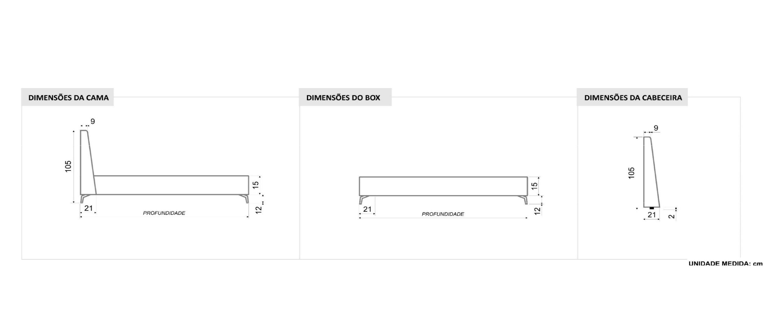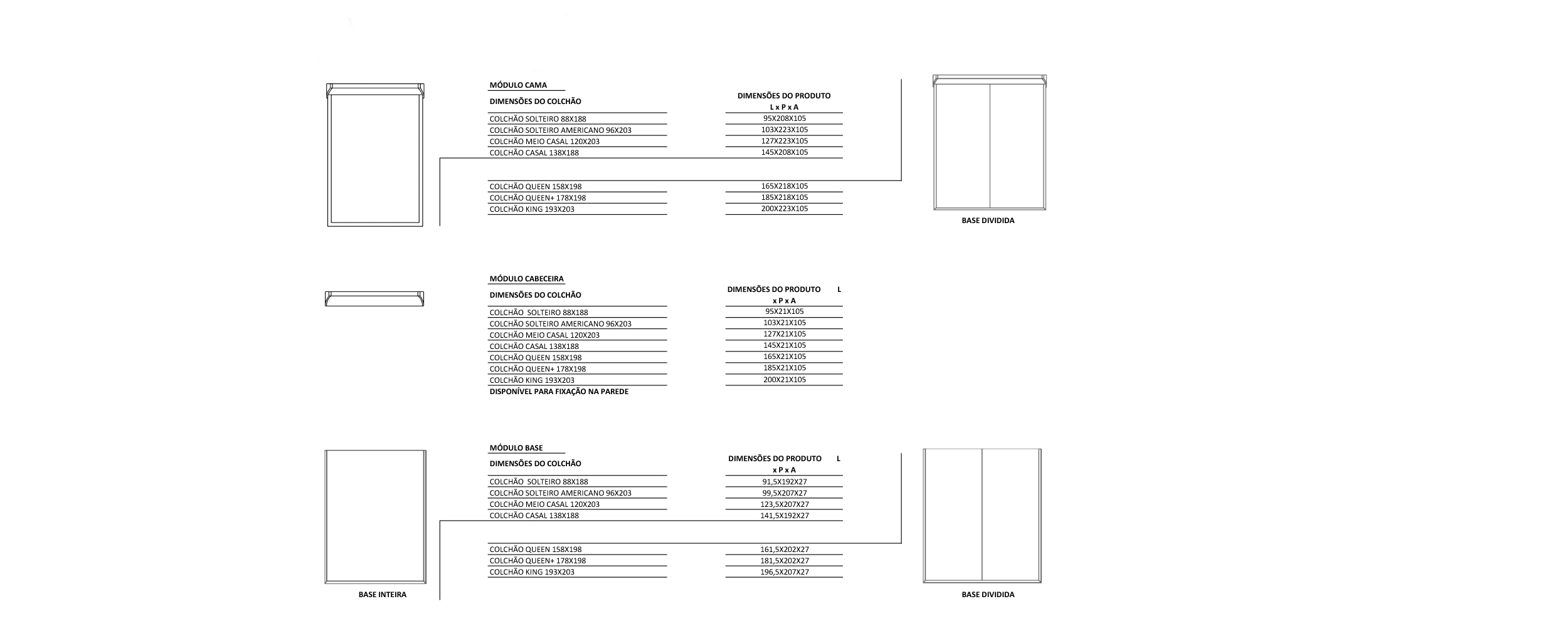 L: 0.95 x P: 2.08 x A: 1.07 para colchão solteiro 0.88 x 1.88 L: 1.03 x P: 2.23 x A: 1.07 para colchão solteiro Americano 0.96 x 2.03 L: 1.27 x P: 2.23 x A: 1.07 para colchão meio casal 1.20 x 2.03 L: 1.45 x P: 2.08 x A: 1.07 para colchão casal 1.38 x 1.88 L: 1.65 x P: 2.18 x A: 1.07 para colchão Queen 1.58 x 1.98 L: 1.85 x P: 2.18 x A: 1.07 para colchão Queen 1.78 x 1.98 L: 2.00 x P: 2.23 x A: 1.07 para colchão King 1.93 x 2.03 |