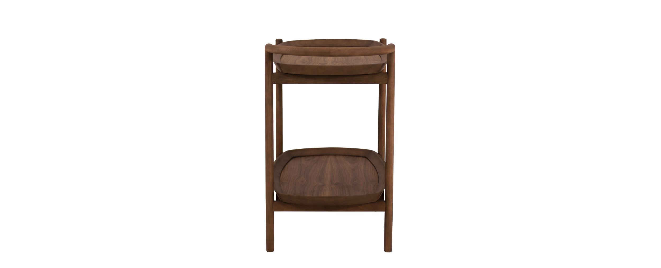 | Estrutura | Em madeira maciça, bandejas em medium density fiberboard revestido com lâmina de madeira natural e detalhe das rodinhas em borracha. |