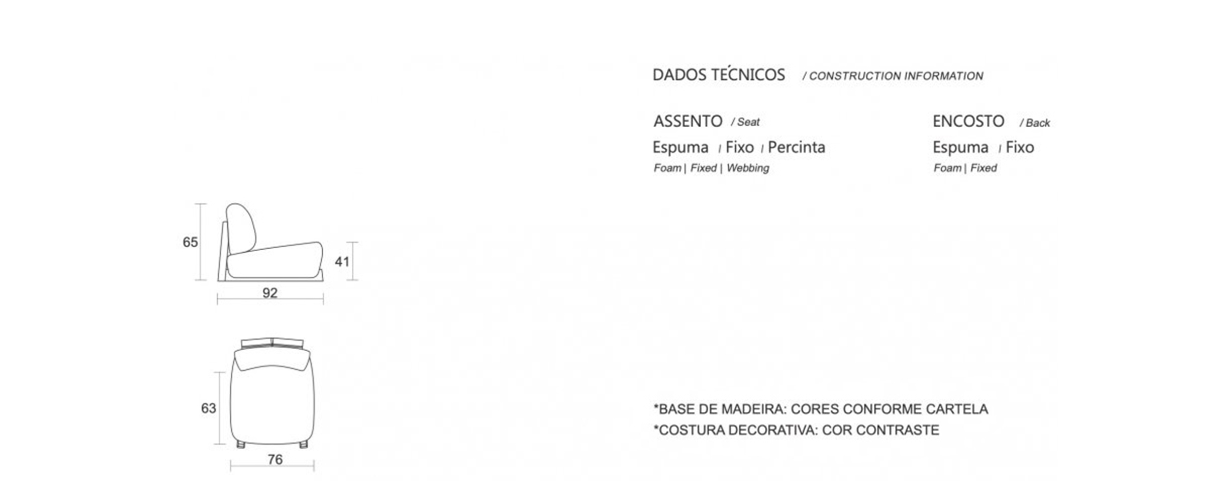 | Estrutura | Estrutura em chapa de compensado de 15mm, base em madeira Tauari. Assento em espuma D30 soft. Encosto em espuma D23 e D26 soft. Base de madeira de diversas opções de cores. |