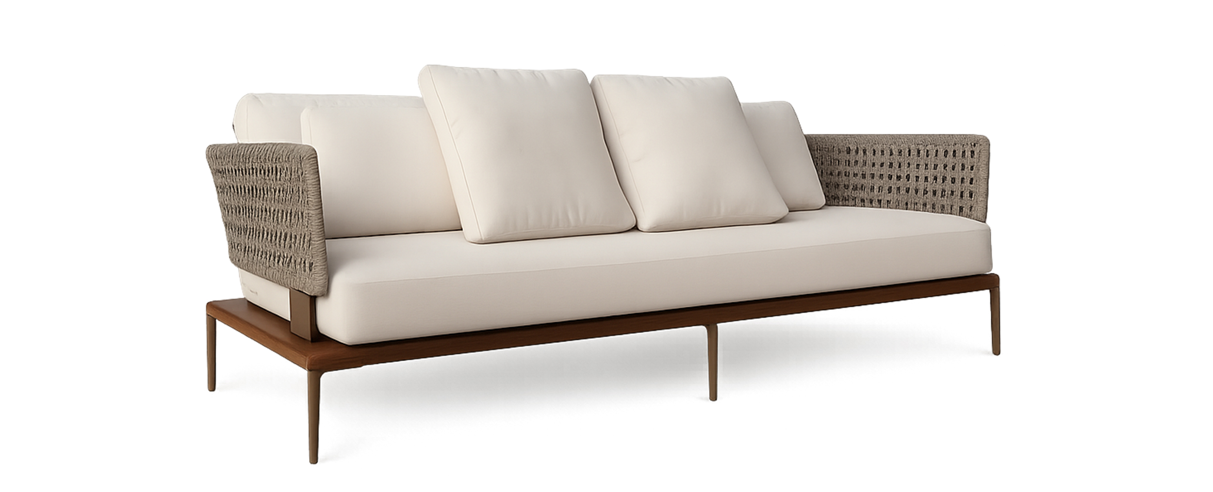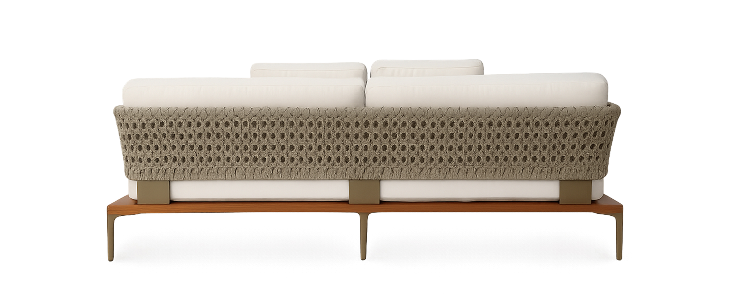 Estrutura | Em alumínio com tecimento em fibra sintética, ou opcional em corda náutica 6mm. Possui a base do assento em madeira, e pés em alumínio fundido com pintura eletrostática. Acompanha almofadas de assento e encosto. |