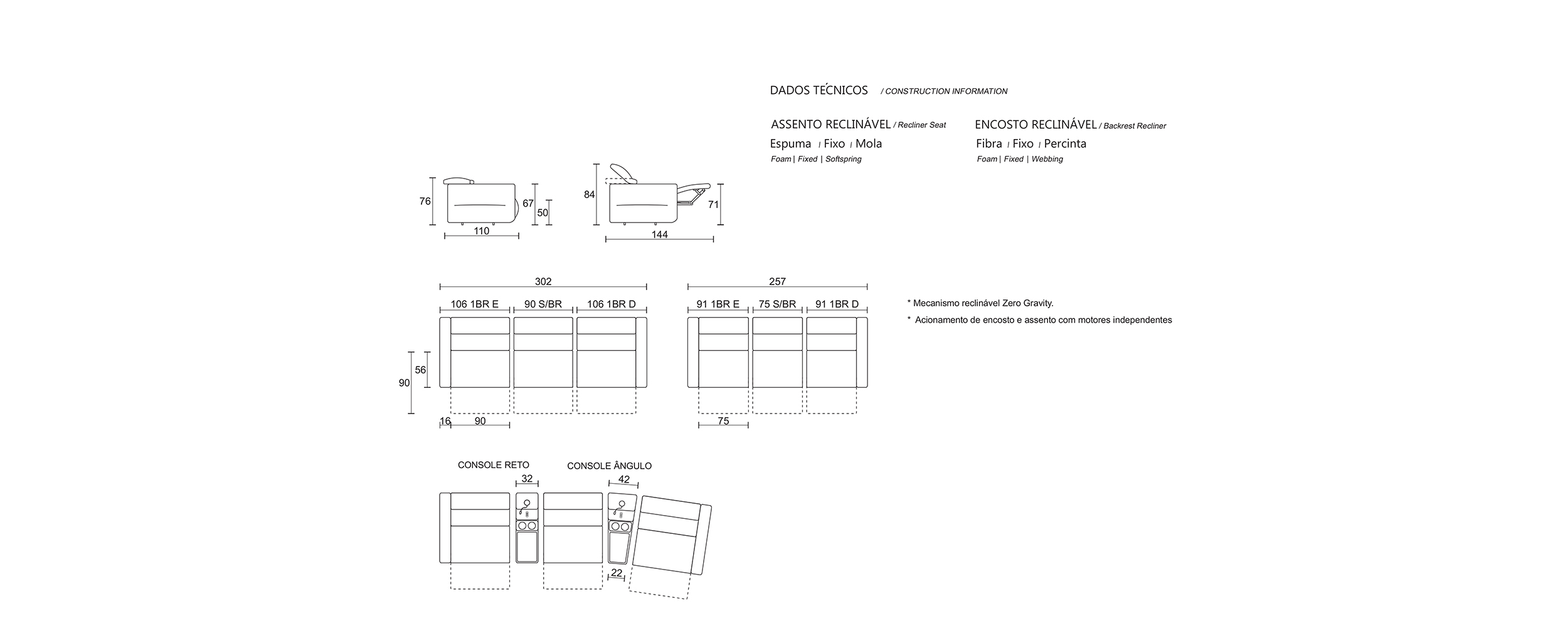 Estrutura | Em madeira de reflorestamento eucalipto, chapa de compensado de 10 e 18mm, caixa de assento chapa de compensado de 18mm e percintas. Caixa encosto chapa de compensado de 18mm. Braços em chapa de compensado 10mm e 18mm. Assento em espuma D30 master soft, espuma D26, D30 e D35 soft. Encosto com espumas D18, D23, D26 soft. Pé metal cor preto. Detalhes: mecanismo de assento zero gravit e mecanismo de encosto articulado independente. |