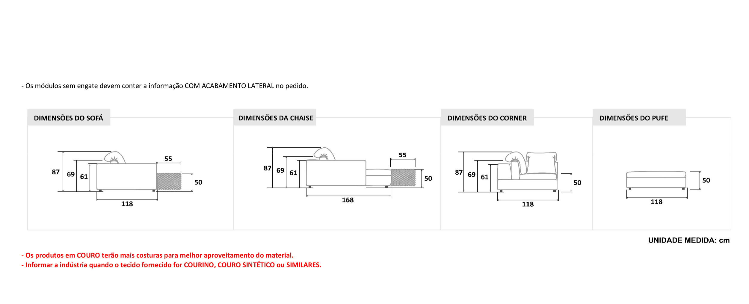 | Estrutura | Estrutura em madeira maciça de reflorestamento, percintas italiana, feltro de proteção entre percintas, espuma sanko. Pés em madeira maciça tauari. |