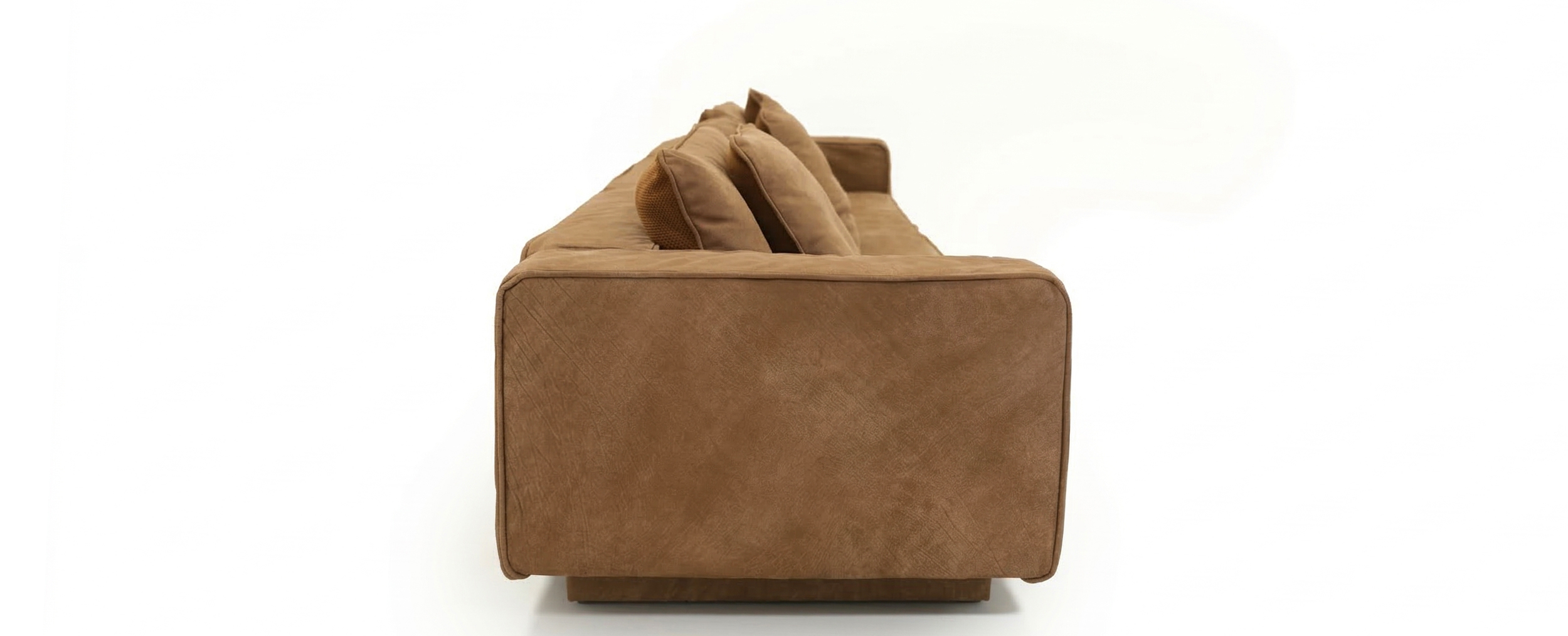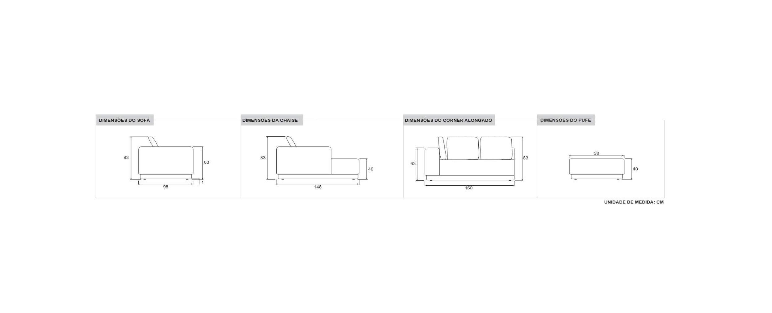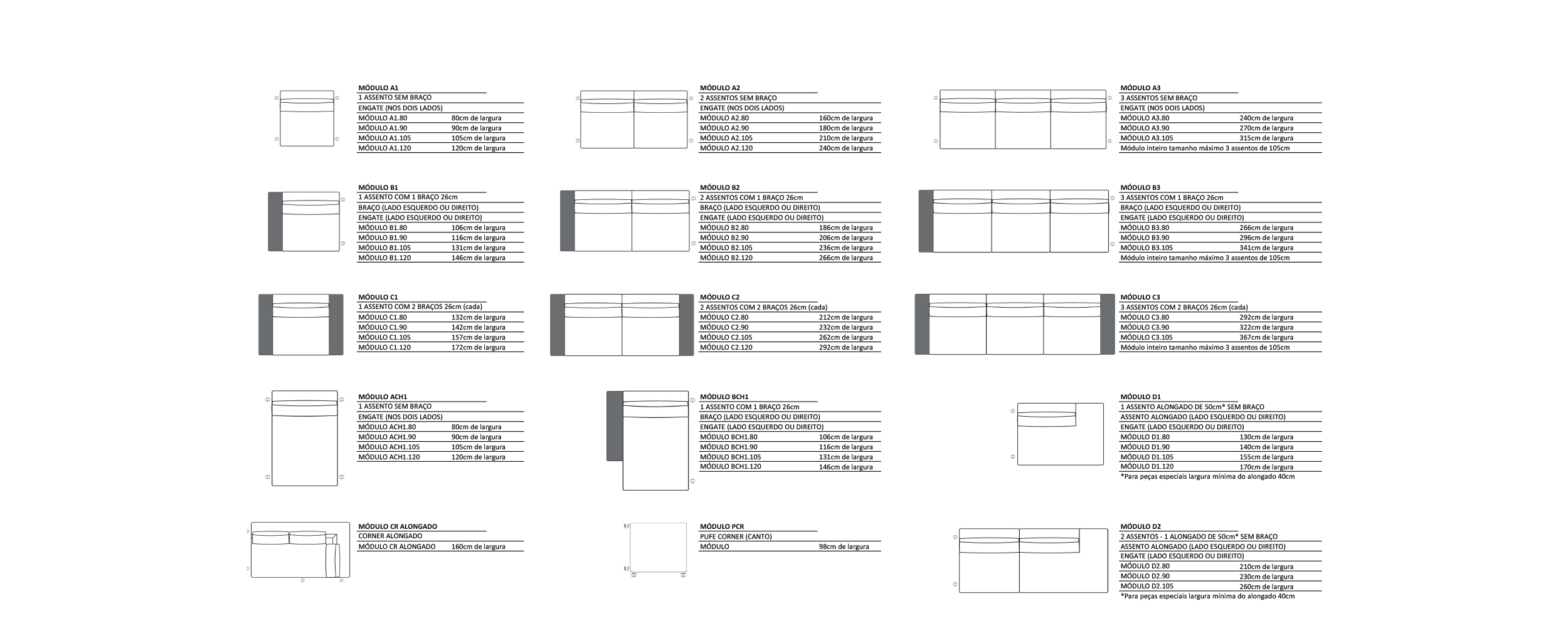 | Estrutura | Estrutura em madeira eucalipto, chapas OSB e compensado. Encosto com almofadas soltas feitas com forro colméia de TNT preenchido com pluma de microfibra de poliéster. Assento fixo almofada assento com duas camadas de espuma de poliuretano D28 com suportes de cargas diferentes. Revestida com manta de microfibra de poliéster. Molejamento com percintas elásticas italianas trançadas, tencionadas mecânicamente e cobertas com feltro de proteção. Base em madeira recuado |